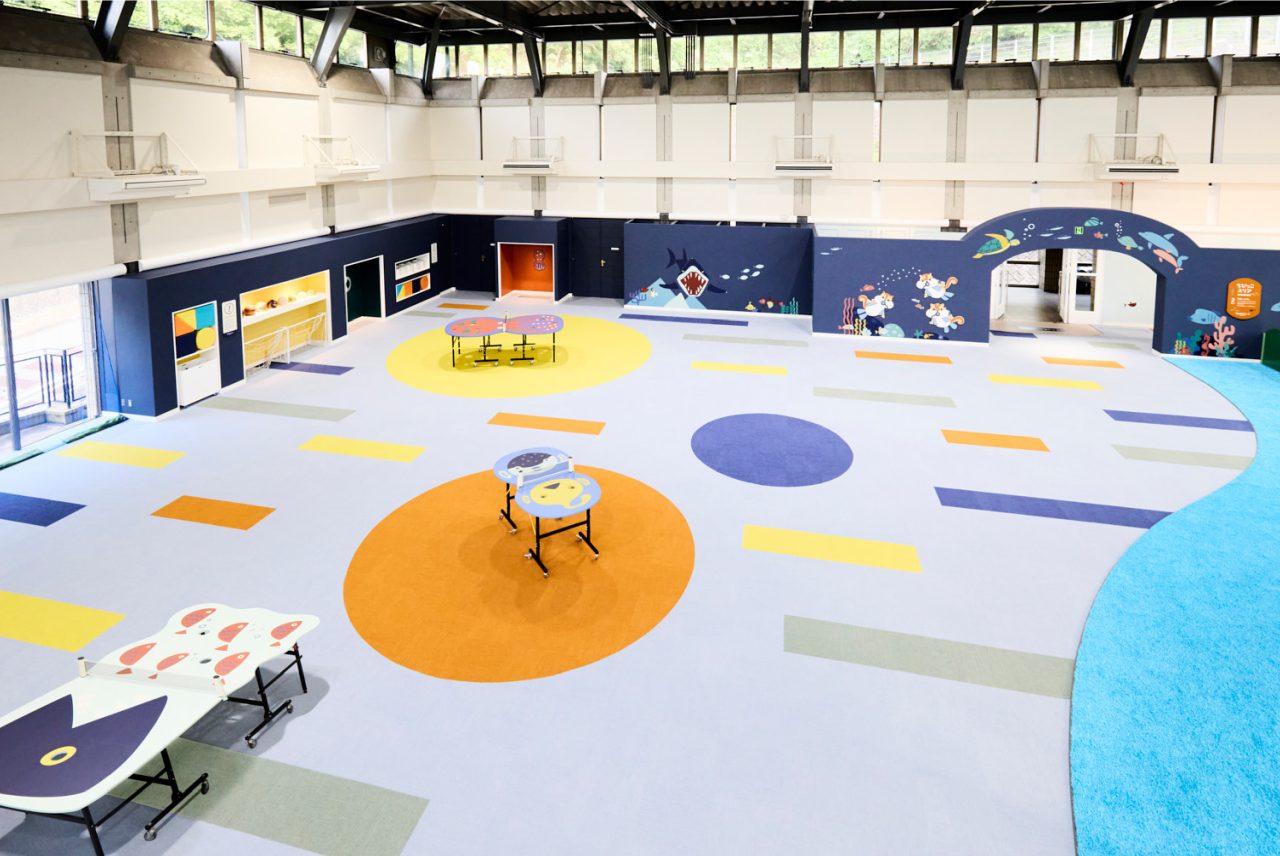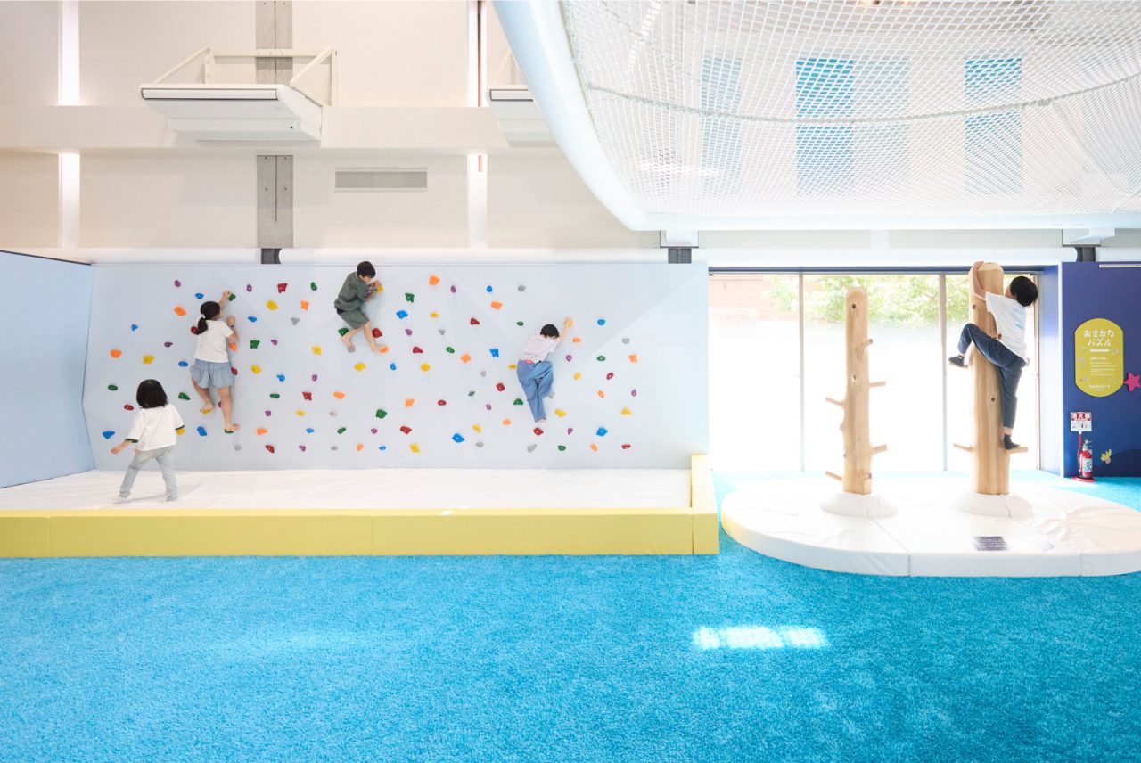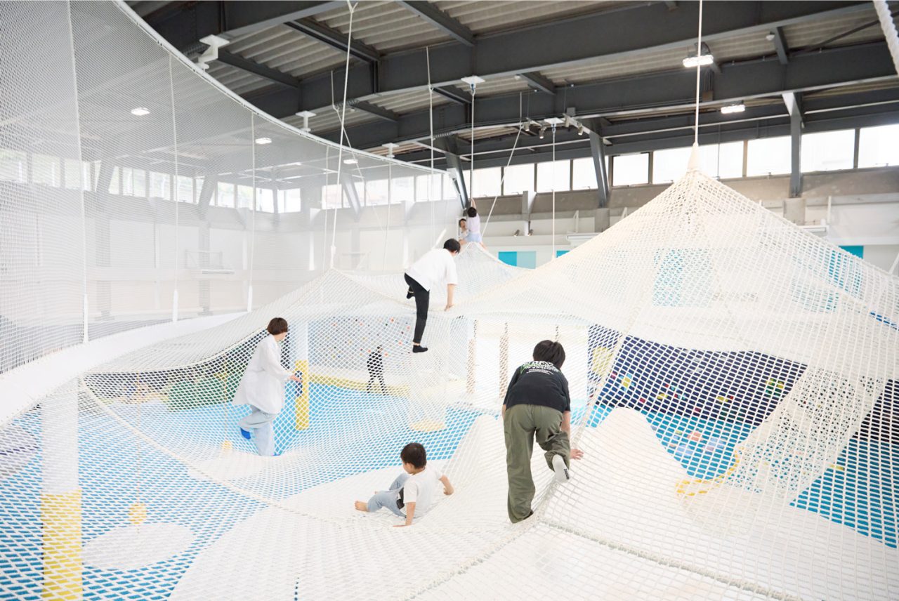 房総の海の中をテーマに、壁には海の生き物たちが泳ぎ、タコや魚の形の卓球台など視覚的にもわくわくする空間に。体育館ならではの天井までの空間を活かした巨大なネット遊具は、足裏を使って身体全体で浮遊感を感じられ、寝転べばハンモックのようにゆったりとくつろぐこともできます。