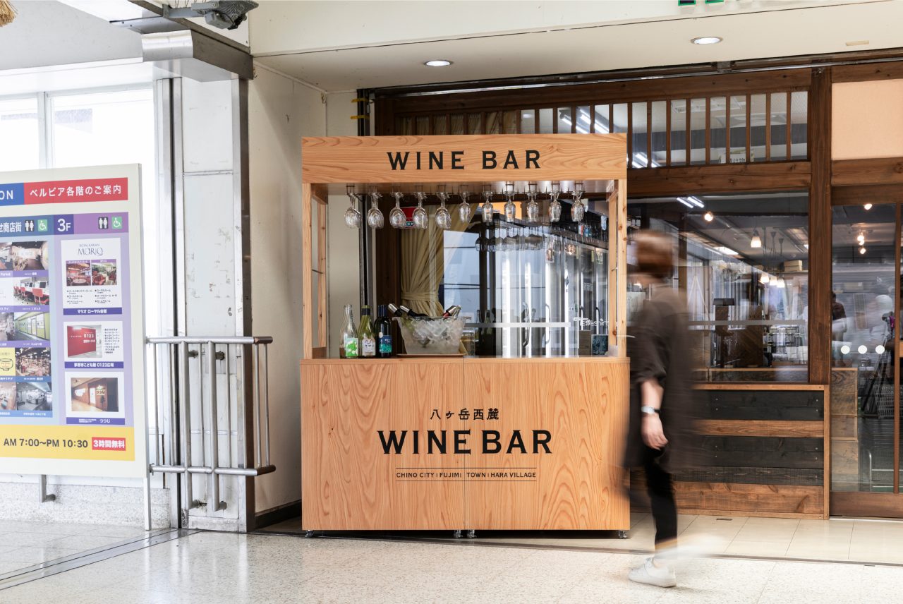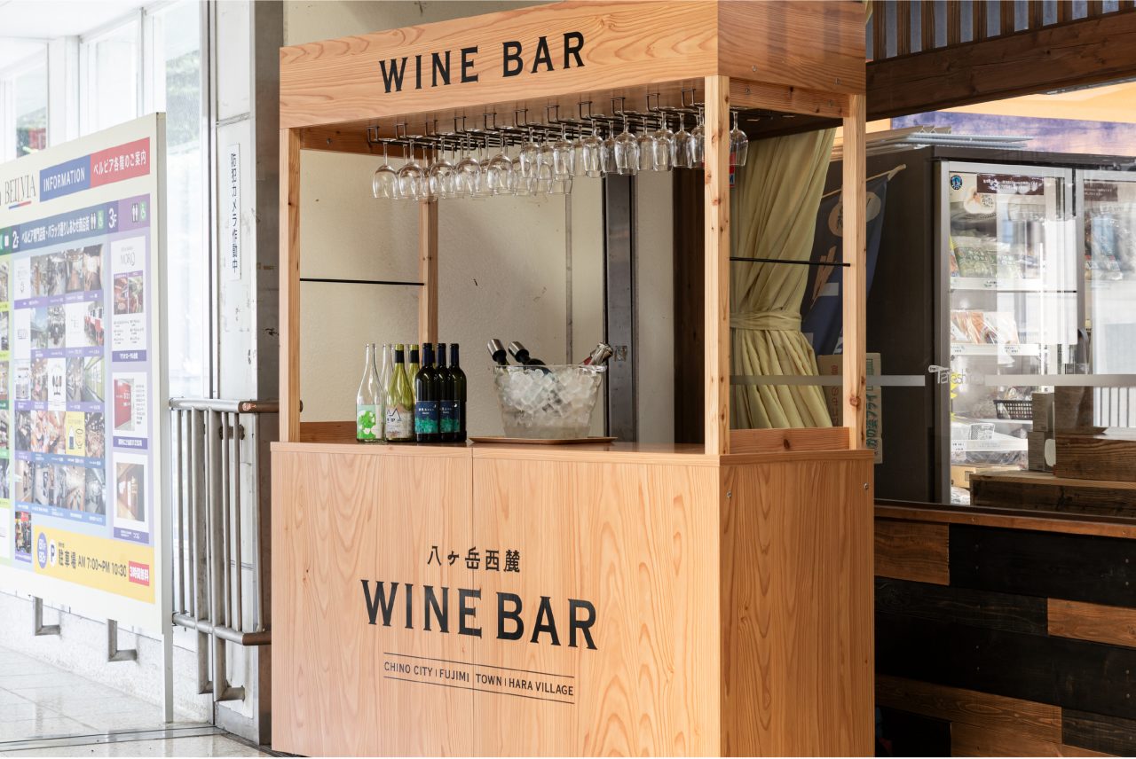 茅野市では、八ヶ岳西麓の自然や文化を活かし、地域のワインと人をつなぐ「西麓ワインバレー構想」が進められています。その取り組みの一環として、八ヶ岳周辺のワインを試飲できるワインバー什器を制作しました。