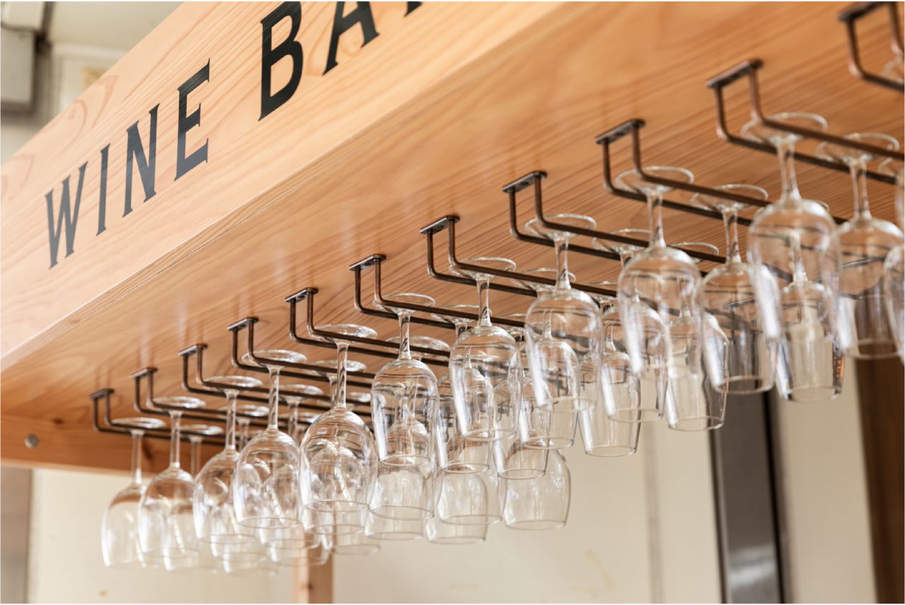 デザインはワインラックやカウンターテーブルを「四角」で構成し、無駄のないシンプルな佇まいが、ワインと向き合う時間を深め、人と人を結び、語らいや笑顔を紡いでいきます。さらに上部にはグラス収納を設け、ワインバーらしい雰囲気を演出。