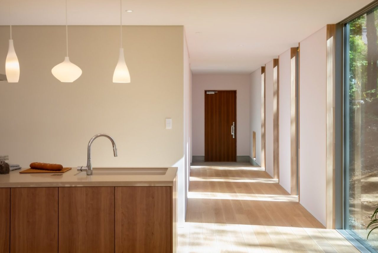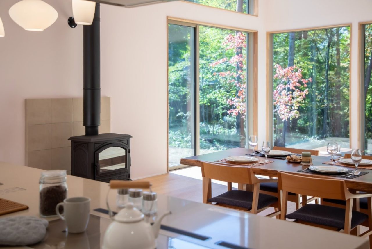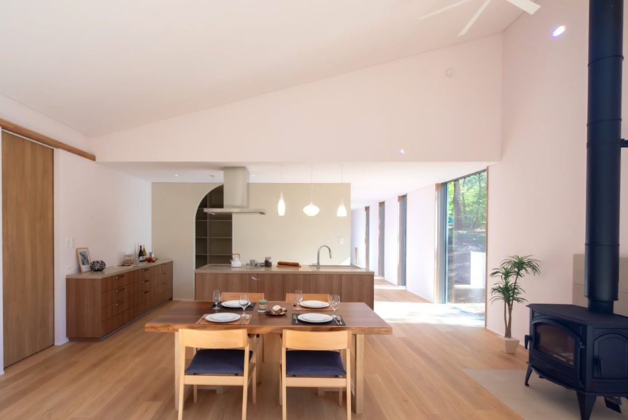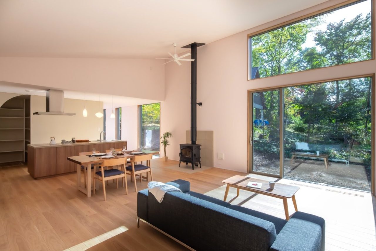 首都圏からの移住者であるS様は、木々に囲まれた静かな立地を気に入り、豊かな自然を楽しむ住まいをご希望されました。慎重な構造設計のもと、周辺の景色を切り取る大きな開口部の連続、それらを生かす広い無柱空間のLDKを実現。ナラのフローリングに落ち着いた色調のペンキ仕上げによるシンプルな内装の空間に、薪ストーブがよいアクセントとなり、森のぬくもりと、窓からの日差しに囲まれる自然ゆたかな生活空間となりました。