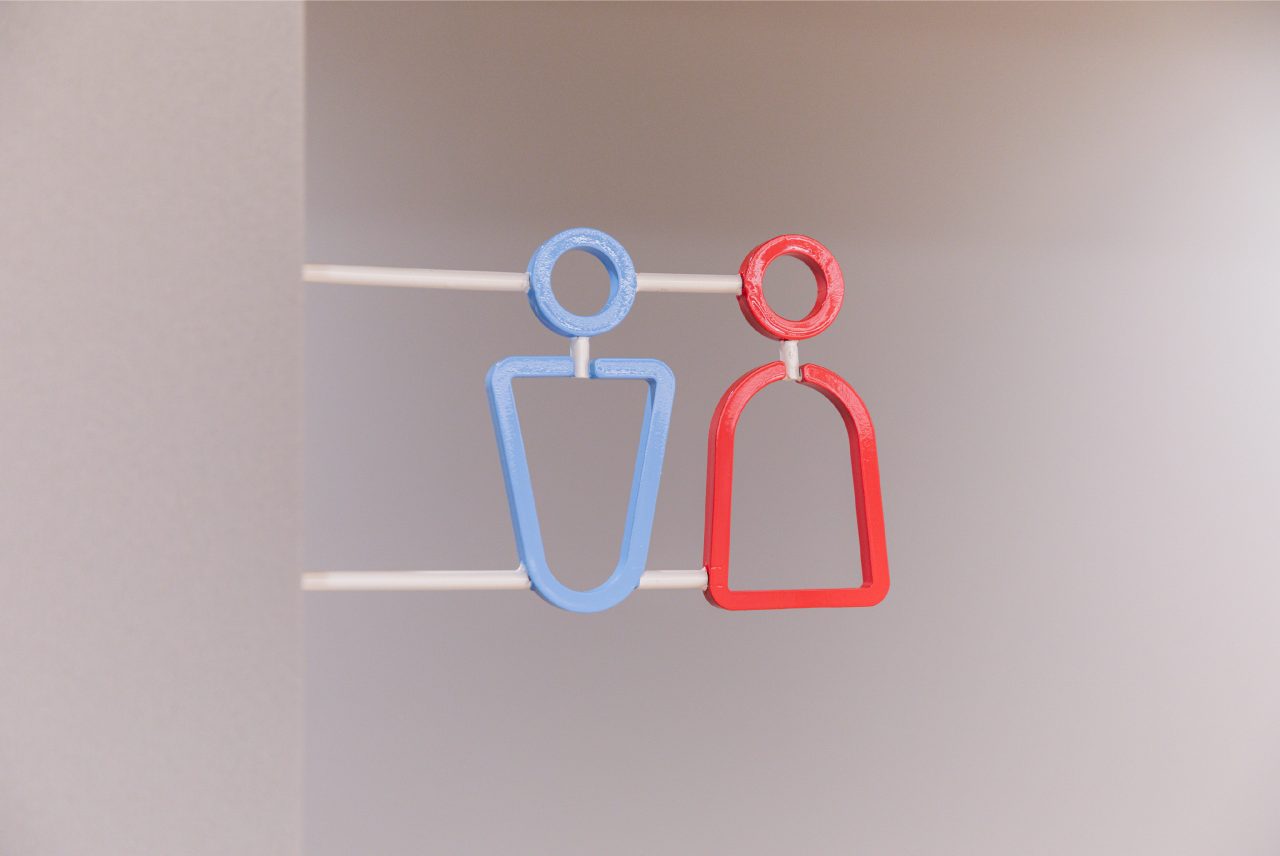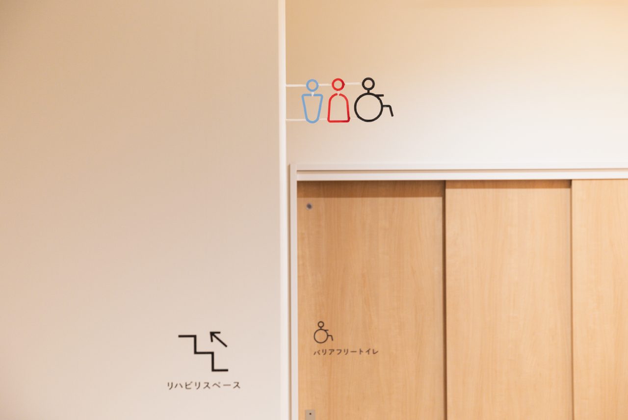 施設全体のサインでは、丸みの帯 びたフォルムと白を基調としたデザインで、空間全体のやさしさと調和するよう設計。整形外科が扱う骨格や関節をモチーフにパイプ素材で造形しました。太さにもこだわり、 細すぎず、適度な太さを持たせることで視覚的にも治療への安心感が伝わるサインとしました。