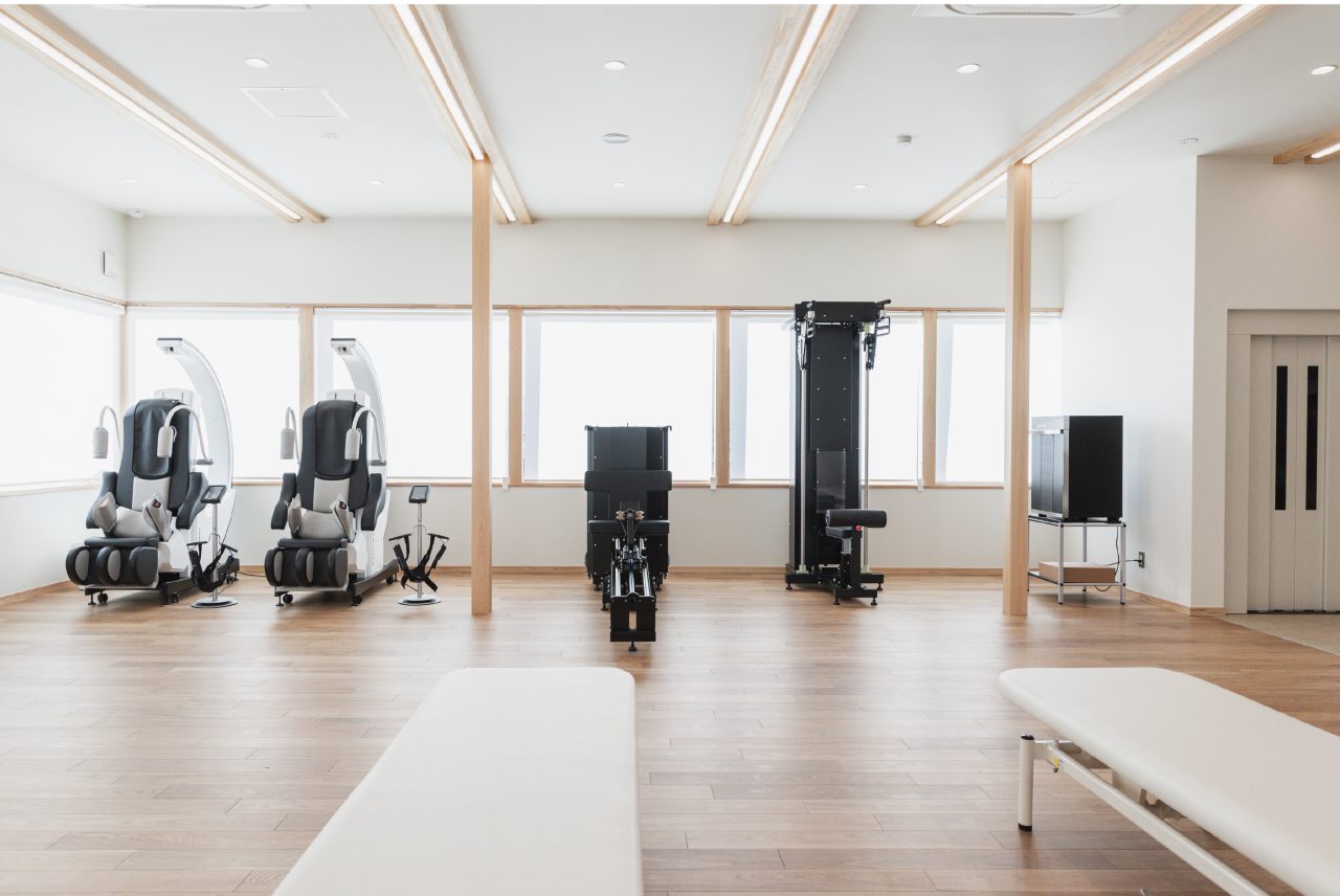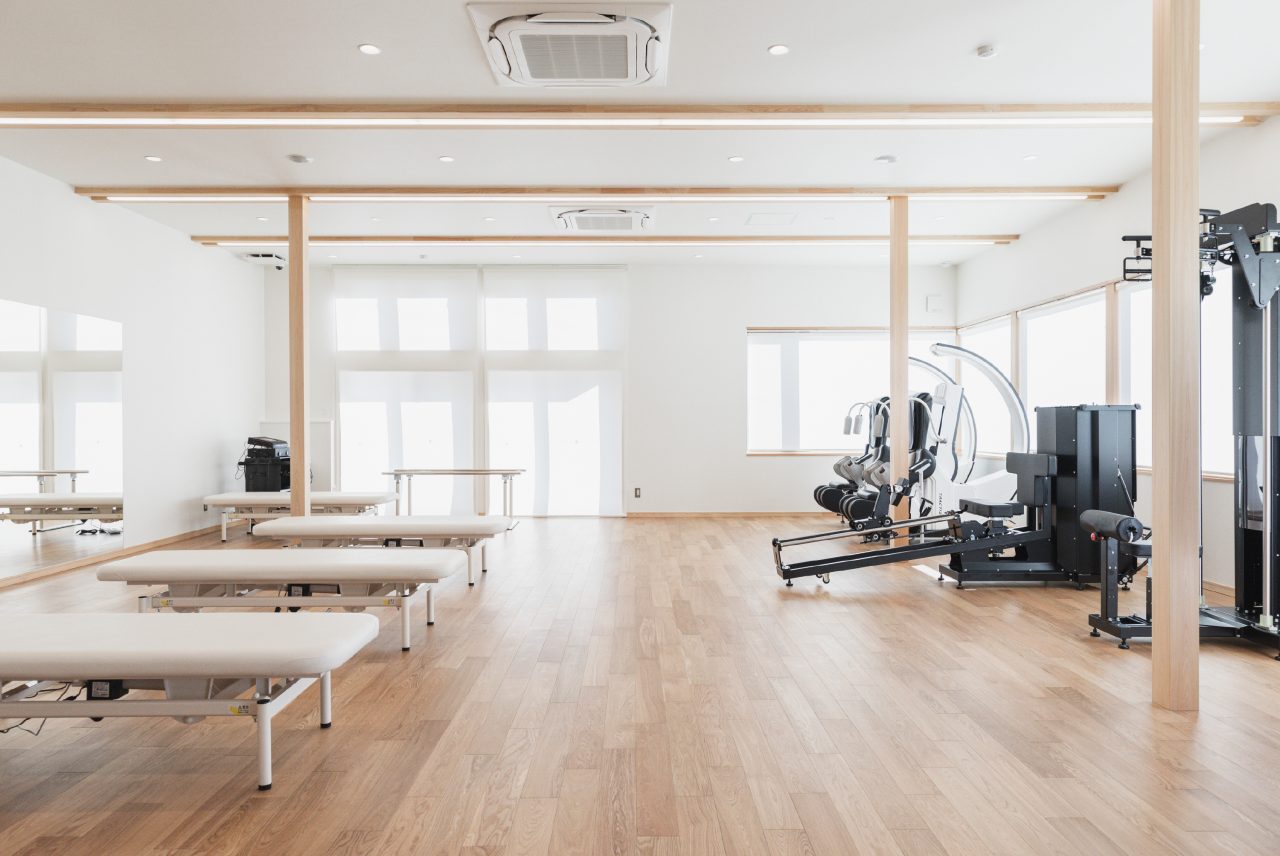 医療施設は「様々な心境」の患者さんが集う場所。テーマは「あたたかさ」とし、1 階の診察や検査、処置を待つ「待合エリア」 は患者さんの緊張を解きほぐすために、あたたかな木の壁と光を取り込む障子を目線に置きました。2階の「リハビリエリア」は大変な運動・訓練をする患者さんの励みとなる よう、あたたかな光を取り込む大きな開口部を設けました。